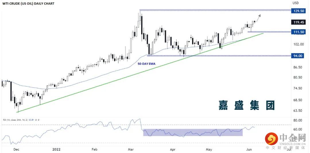 如上所述,油价业已上涨数月,截至目前的最高点是3月初创下的130一线。之后的4月和5月初围绕100盘整,现在多头再度蓄力,看高一线。