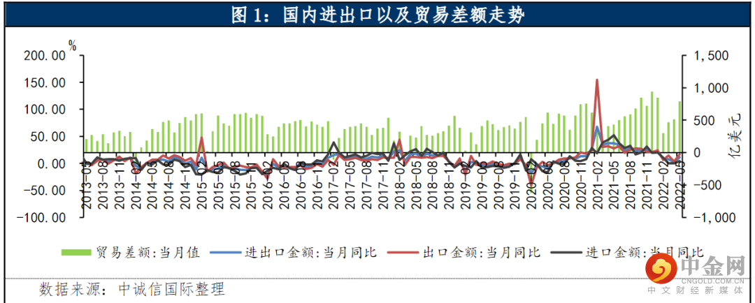 2022年5月出口(美元计价)同比增长16.9%,预期7.3%,前值3.9%;进口同比增长4.1%,预期0.6%,前值0%;贸易顺差787.6亿美元,扩大82.3%。
