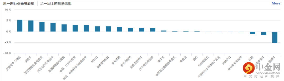 从行业板块表现来看,家庭与个人用品、保险、医疗设备与服务、汽车及零部件等板块涨幅居前,能源、公用事业、运输、房地产、半导体等板块跌幅居前。
