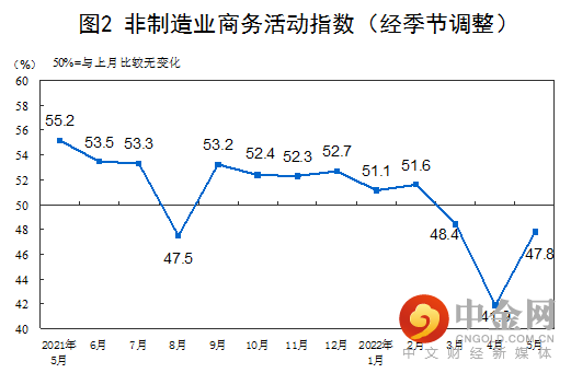 5月份,非制造业商务活动指数为47.8%,比上月上升5.9个百分点,非制造业景气水平明显改善。