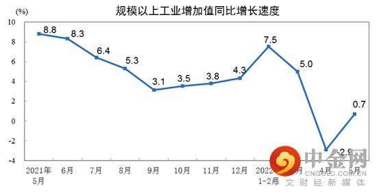 5月份,规模以上工业增加值同比实际增长0.7%。从环比看,5月份,规模以上工业增加值比上月增长5.61%。1—5月份,规模以上工业增加值同比增长3.3%。