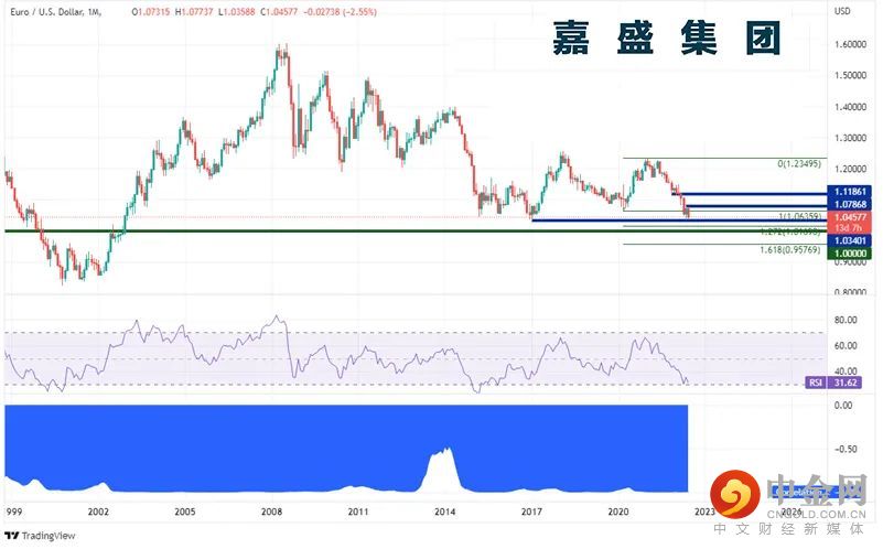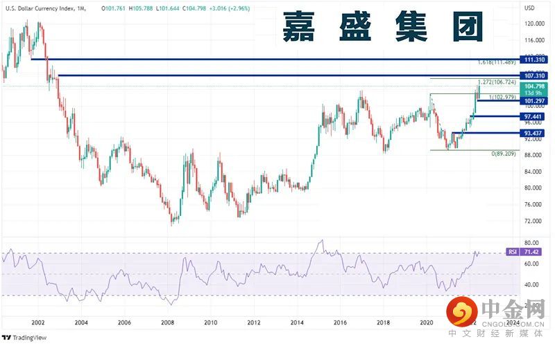 美元指数的较长期图表显示,受益于加息前景,价格摸至2002年11月以来最高点。月图第一阻力在2020年3月高点到2021年1月低点行情的127.2%扩展位,即106.72附近,然后可能上看2002年12月以来水平阻力位107.31,接着或上攻由2001年9月以来水平阻力位和前述行情的161.8%扩展位组成的阻力带,即111.31/111.49一线。但请注意,月图RIS正处于超买区域,小心价格回撤的可能性。第一支撑位在5月低点101.30,然后是水平支撑位97.44和93.43,以及2020年3月低点89.21。