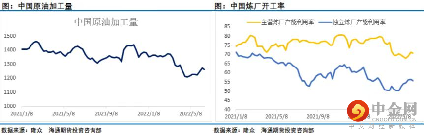 中国市场原油加工量连续回升之后上涨显示有再次回落继续,目前中国原油加工量仍远低于往年同期,疫情对中国市场形成的冲击超乎市场预期,目前看来恢复进度不及预期,虽然中国临时追加了450万吨成品油出口配额,但中国炼厂开工率恢复仍然较慢,有数据显示中国炼油厂运营量同比下降11%,这是十多年来最大的变化,这一局面还会延续多长时间仍需进一步观察,目前来看中国市场疲弱的表现对国内市场影响明显,成品油表现远落后于国际市场,SC原油期货较国际油价贴水也创出年内新低。