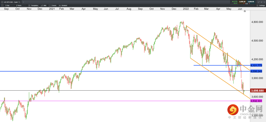 标普500指数已经到达我们此前的年内目标低点3600 – 3650附近,从4小时的结构来看,该位置处在4小时下行通道的下轨支撑处,因此,不排除该位置出现技术面的反弹。但预计反弹幅度有限,因为本周的鹰派言论将打压价格涨势。从市场预期的角度来思考,7月13日将公布美国6月通胀数据,根据我们此前分析,6月的通胀数据在能源价格的下跌背景下或出现一定回落,因此市场将强化美联储在7月加息50bps的预期,这将为美股带来提振作用,但从时间维度来看,距离数据公布仍有三周时间,因此现阶段仍存在进一步下挫引爆市场恐慌情绪的概率。