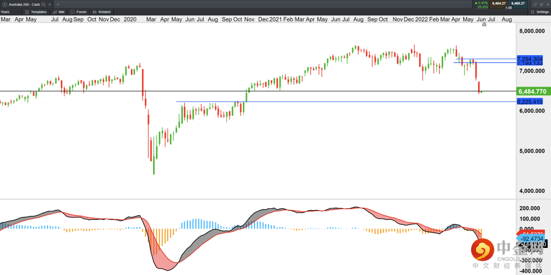 澳洲200指数出现连续两周放量下跌之势,主要受到1)美股作为风向标出现连续大跌,2)澳联储的超预期50bps的加息,市场情绪处于悲观。MACD指标进入到空头区间,并有进一步发散之势,因此,该指数仍存在进一步下挫的空间。从周线级别来看,下方的支撑位于2020年6月-11月的震荡区间的上轨支撑,因为其震荡区间持续5个月,因此可判断该位置积聚了大量的买方筹码,因此第一支撑可参考6200 – 6250。