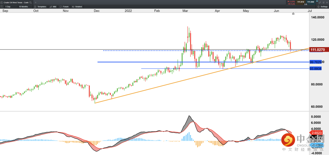 从形态来看,油价仍处于自2021年12月以来形成的上行趋势中,但MACD指标已经在日线级别形成死叉,周线级别MACD指标也呈现背离迹象,价格或面临进一步的回落风险,投资者当前关注110,如若该位置失守,价格将进一步下跌至100附近。