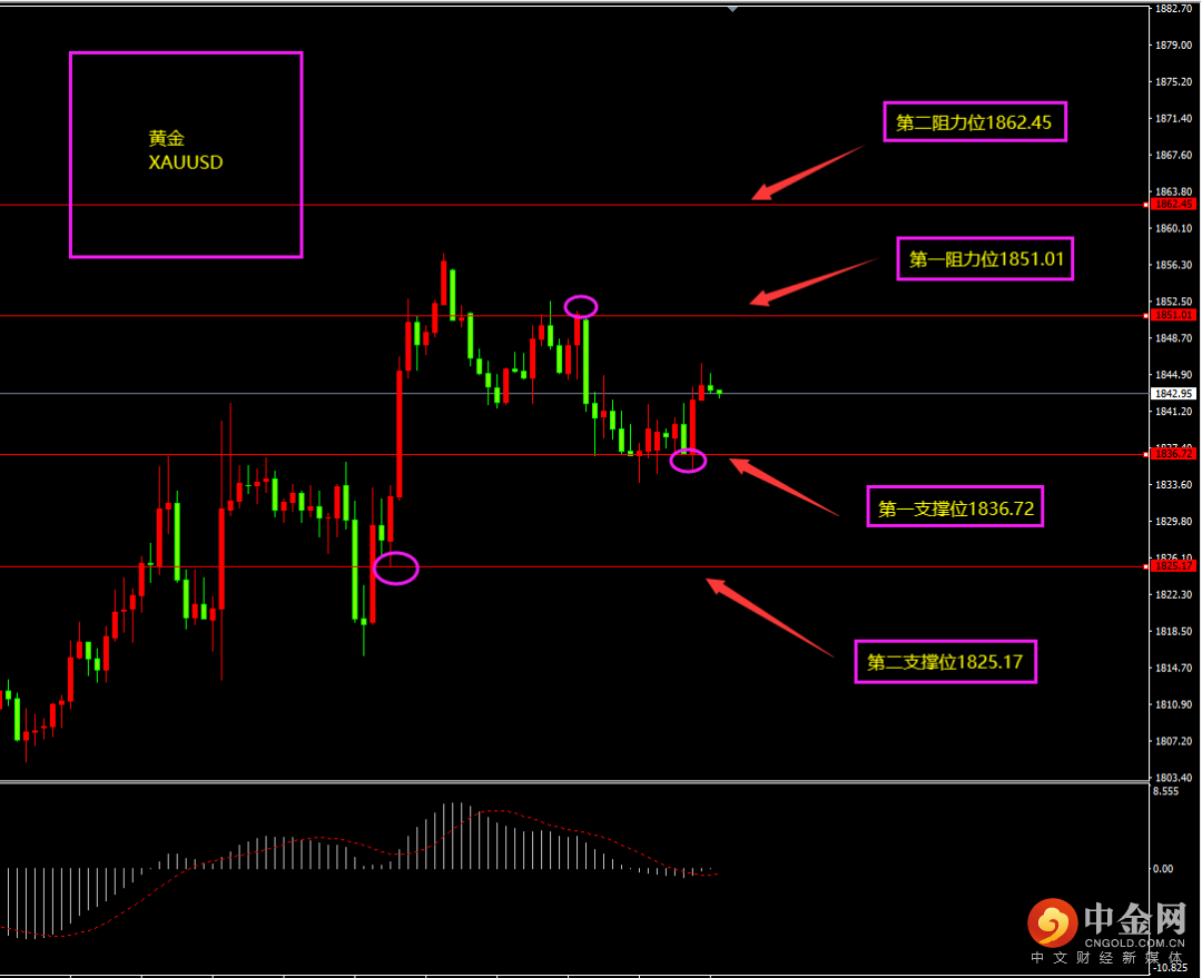 天图黄金收阴线,价格有所回落,看似空头占优,但MACD并未大幅回落,空头不强,目前大方向仍保持看涨,随着价格重心上移,日内更多以逢低看多为主。小时图黄金期间连续阴线回落,但MACD并未大幅下滑,空头不强,短期底部有连续阳线产生,多头有所增强,日内更多以震荡以及震荡上行为主。