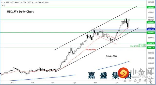 如上所述,美联储不断透露强硬立场。美联储仍是主要央行中立场最积极的一家,这点应可约束美元的下行空间,特别是美元兑那些央行立场依然温和的货币,即日元。日本央行上周按兵不动,美元/日元随后收复135整数位,蓄势上攻140的动能保持不变,途中没有任何明显的阻力: