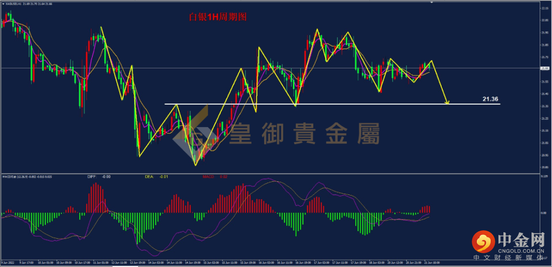 从白银1H走势结构来看,行情此前自高位回调,下行至20.88低位后开启反弹,从反弹走势结构来看,行情在向上推动的过程中,MACD红色动能柱出现逐步收敛的状态。其后行情下破前低,开启回调。目前价格处在回调过程中的横盘震荡阶段,MACD快慢线处零轴下方弱势状态,且5-10期均线出现明显缠绕状态。策略上建议逢高布局空单为主。