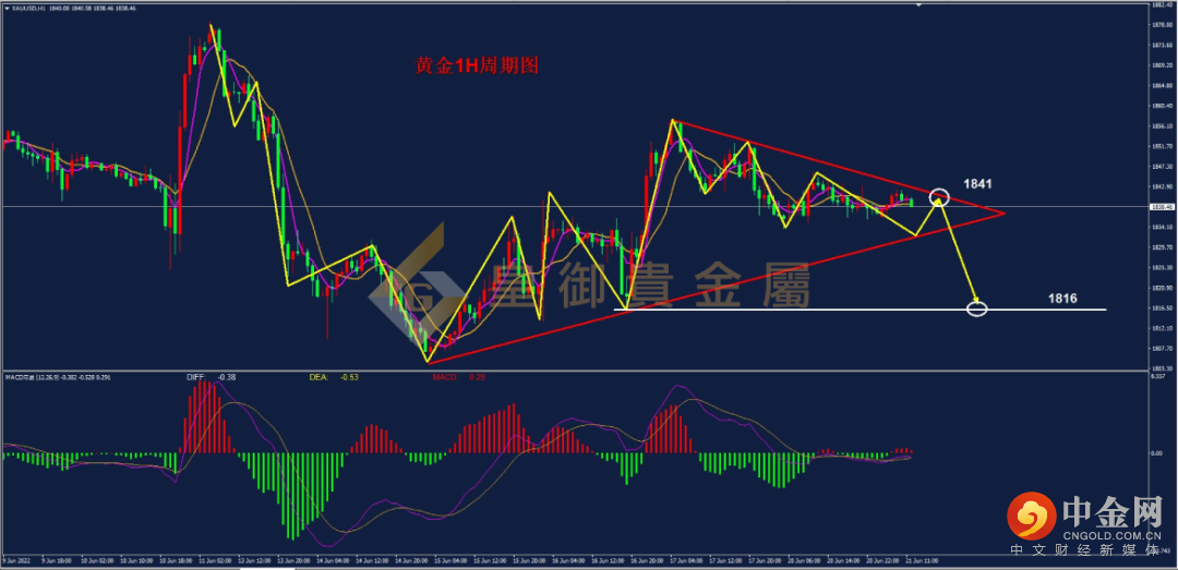 从黄金1H走势结构来看,行情自1878高点走了一波五浪下行走势结构,企稳1805之后开启反弹,整体的反弹力度弱于前期下跌动能。行情下跌时MACD绿色动能柱面积大于行情上涨时的红色动能柱面积。价格在到达1857之后开启回调,目前行情呈现高低位下移的空头结构,预计行情将维持向下调整的趋势。策略上建议布局空单为主。