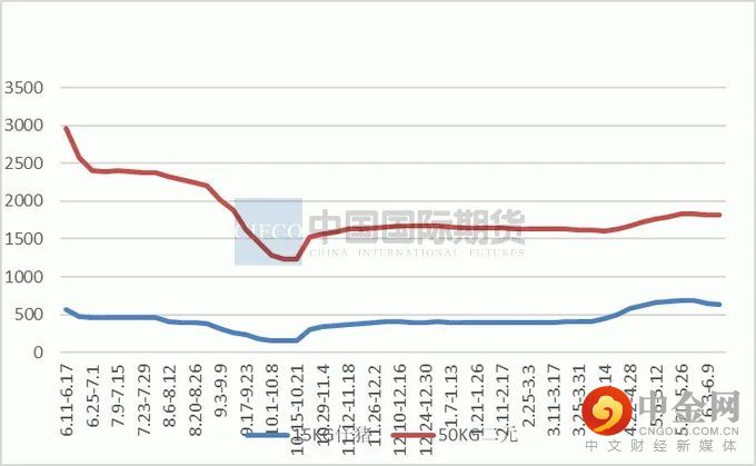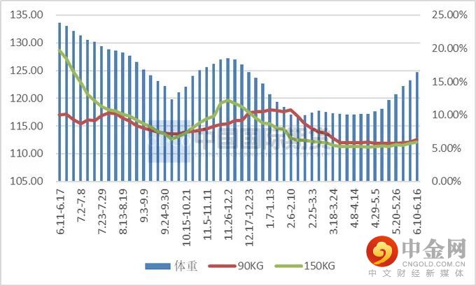 上周全国出栏平均体重124.69公斤,较前一周涨1.19%,150公斤以上出栏占比5.95%,增加0.27%;90公斤以下占比6.26%,增加0.31%。上周出栏均重继续增加,养殖端压栏惜售,对于理论上7月供给缺口行情较看好,虽然夏季对肥猪接受度降低,但体重难降。南方梅雨天气导致小体重猪出栏增加。