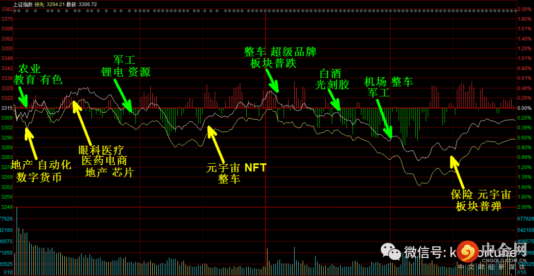 A股开盘三大指数开盘小幅低开,沪指低开0.05%,深成指和创指低开0.08%。汽车热管理板块继续高开领先,教育板块低开。开盘后教育、农业、有色等板块下跌,指数低开下探。地产、机器人、数字货币板块上涨。临近10点眼科医疗、医药电商板块上涨。随后地产、半导体板块拉升。三大指数翻红。10点半后锂电、资源、军工板块下跌,指数重新调整。11点元宇宙NFT、整车板块上涨。午后开盘整车、超级品牌等板块普跌。1点半白酒、光刻胶等板块下跌。2点过后机场、整车、军工等多数板块下跌,沪指跌超1%。2点半元宇宙、保险等多数板块反弹,指数止跌回升。收盘沪指跌0.26%,深成指跌0.51%,创指跌0.63%。两市超6成个股绿盘,涨停个股60家,跌停个股10家。