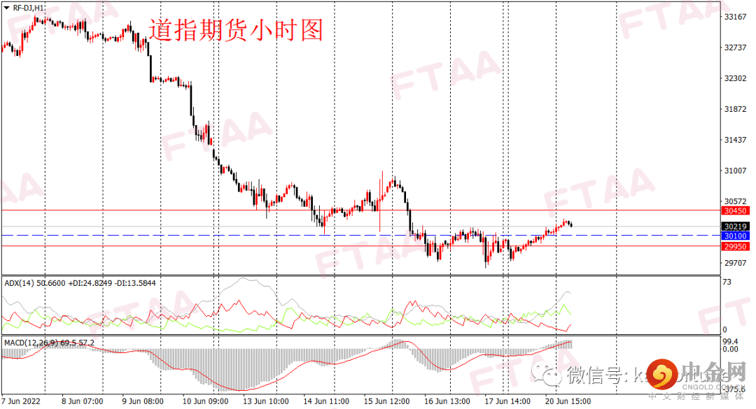 周一美股假日休市一天,但上周五三大指数均现止跌迹象。昨日欧盘时段欧股反弹。消息面基本平静。道指期货在亚欧盘维持震荡盘升,在小时图MACD指标底背离后,当前该指标已经翻红。日内或延续震荡略偏多。今早亚盘道指期货维持强势震荡。操作上可持有多单,或逢低在30100附近轻仓多,止损29950,目标30450。