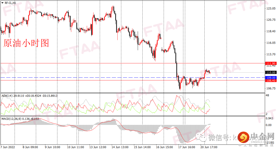 原油周一宽度震荡,最高109.14,最低106.81,日图收出长下影十字,显示短期空头再度发力,但多头回弹,连续下跌后收下影小K,短期或有止跌概率。小时图看,昨日美国假期消息面平静,油价横盘波动,今日亚盘油价开盘反弹,当前维持窄幅波动,小时图级别或维持震荡偏多。操作上可持有多单,或逢低在109附近轻仓多,止损108.40,目标111.90。