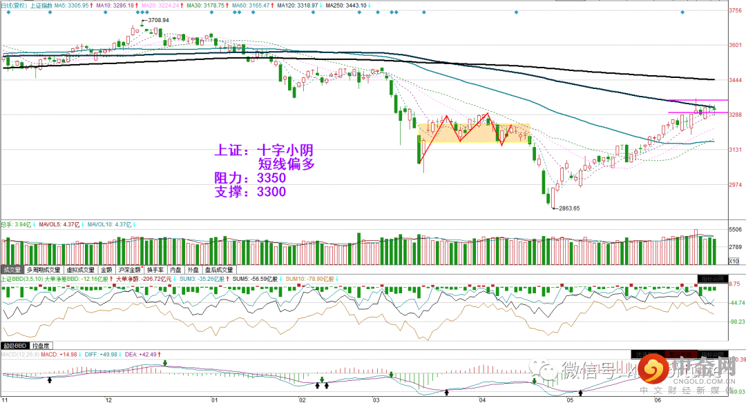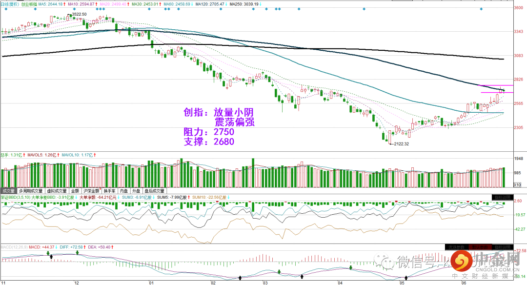 周一沪指收十字星,深成指和创指短期新高,市场趋势看多。今日指数低开后一度震荡,但尾盘收复大部失地。收盘三大指数均收下影小阴,均在5日线上运行,日图形态上属于上涨中继,后续可关注5日线支撑作用,线上可继续持股为主。