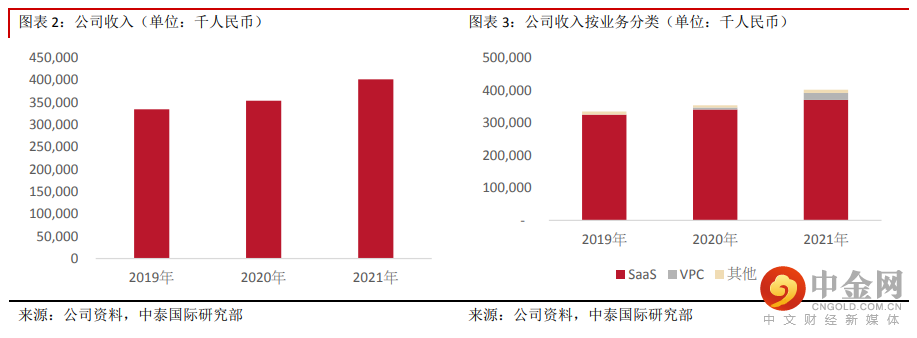 近 3 年公司总收入的年复合增长率为 9.6%,并于 2021 年达到约 4亿元,其中九成以上收入来自 SaaS 解决方案业务,来自科技、教