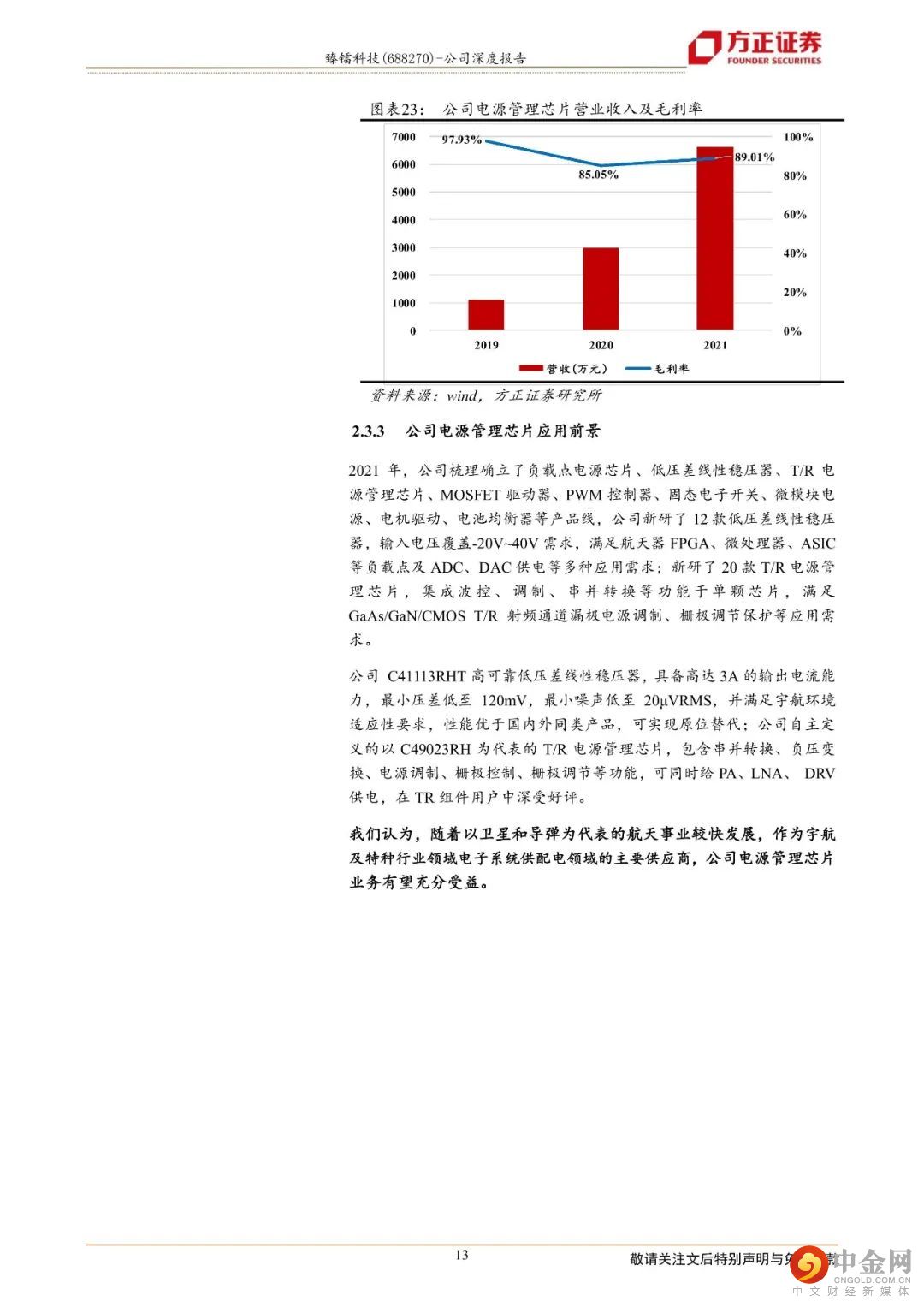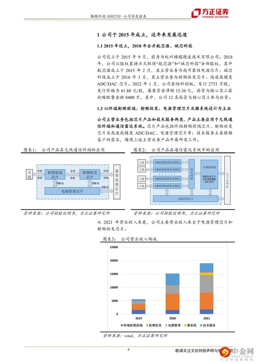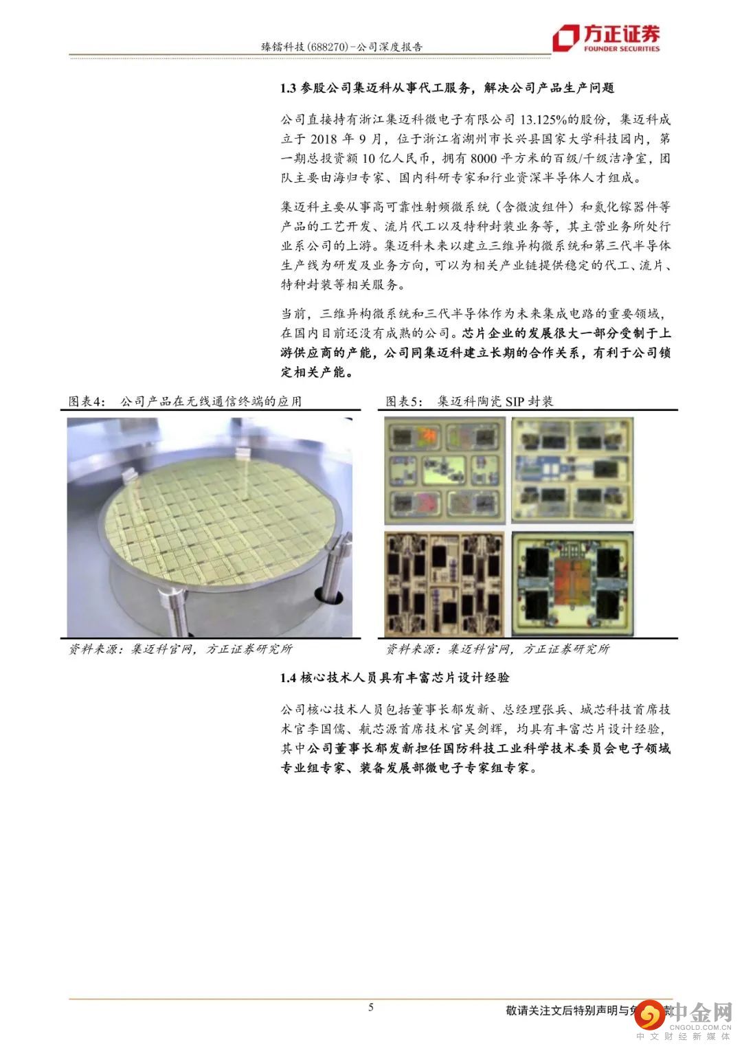 公司从事终端射频前端芯片、射频收发芯片及高速高精度ADC/DAC、电源管理芯片等研发生产,主要用于特种行业通信、数字相控阵雷达、宇航电子等领域,公司核心技术人员均具有丰富芯片经验,董事长郁发新担任国防科技工业科学技术委员会电子领域专业组专家、装备发展部微电子专家组专家,参股公司集迈科主要从事高可靠性射频微系统和氮化镓器件等产品的工艺开发、流片代工以及特种封装业务,有助于公司锁定稀缺产能。