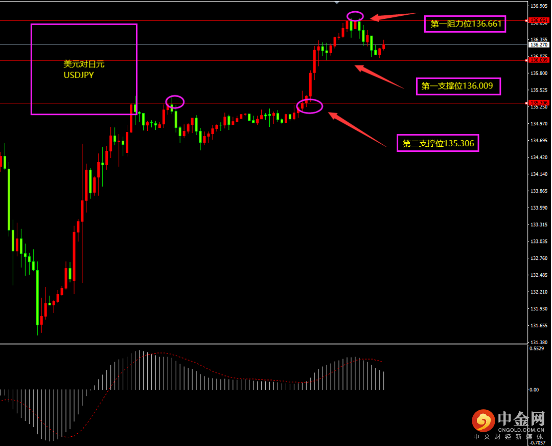 天图英镑收阳线,价格小幅冲高,但实体部分较小,多头有所减弱,而上影线较长,空头仍在,短期或再度进入调整阶段,日内更多以震荡以及震荡下行为主。小时图英镑期间连续阴线下滑,MACD转移至0轴之下,空头占优,短期底部无大阳线立足,多头不强,日内更多以震荡以及震荡下行为主。