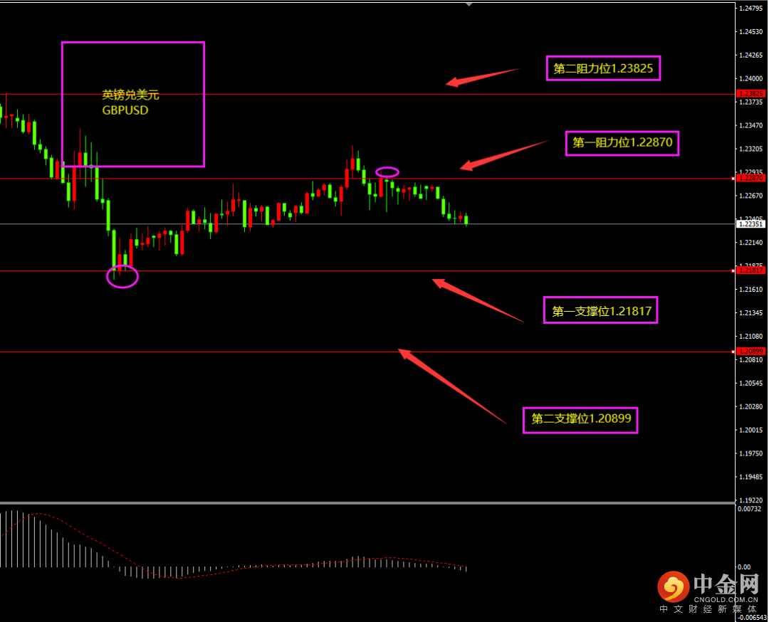 天图欧元收阳线,价格小幅冲高,但实体部分较小,多头有所减弱,而上影线较长,空头仍在,短期或再度进入调整阶段,日内更多以震荡以及震荡下行为主。小时图欧元期间连续阴线下滑,MACD转移至0轴之下,空头占优,短期底部无大阳线立足,多头不强,日内更多以震荡以及震荡下行为主