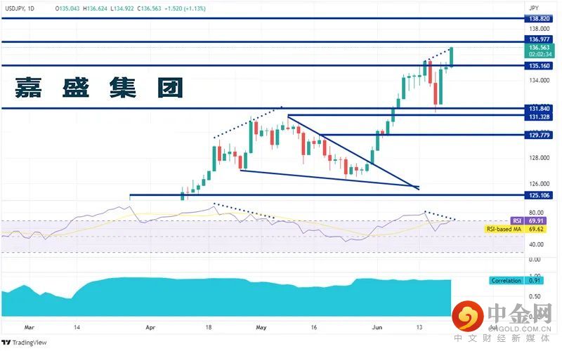 但请注意,日图RSI目前与价格背离。4月底/5月初出现同样情况时,价格回落至下降楔形内。这次历史会重演吗?如果重演,价格可能先后下看6月14日以来高点135.47、6月16日低点兼5月9日以来前高点131.33和水平支撑位128.78。