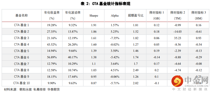 2.CTA基金的分散化程度较高。GB指标与Sharpe表现相关性最高为18.57%; Alpha与Sharpe的相关性次之,为13.01%。所以,CTA基金的表现依然和管理人的择时能力,Alpha的挖掘能力有关,但是却并非决定性因素。我们认为商品市场交易的灵活性(如多空和T+0交易规则等),导致无论是牛熊市,都存在可以获利的投资策略。同时也说明,CTA基金投资在国内还是一个相对宽阔的赛道,投资策略并未显著趋同,甚至交易模式和交易频率都有明显差异,再结合股商大类策略的低相关性,不难看出FOF投资可挖掘的机会还相当丰富。