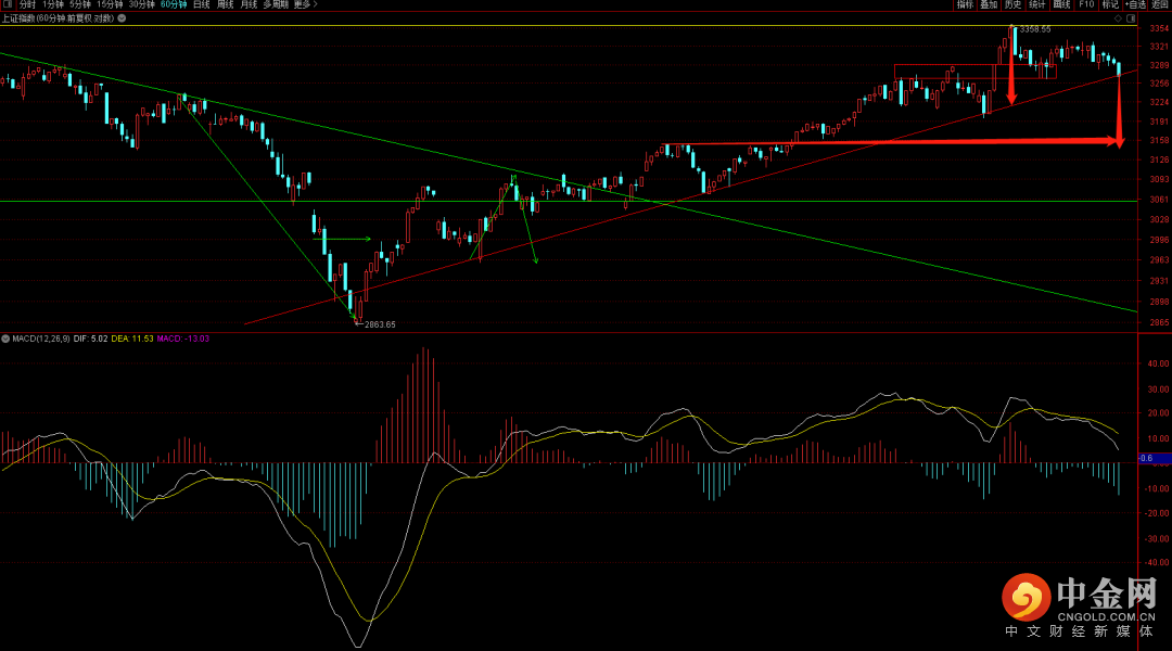 大盘跌破六十分钟上升趋势线,短期需要注意日线顶分结构已经形成,后续大概率会回落至3105到3165这个区间,注意把控好后续的高抛机会。由于六十分钟有出现底分的结构,这边注意回抽如果无法突破3335点大概率会呈现加速调整走势。