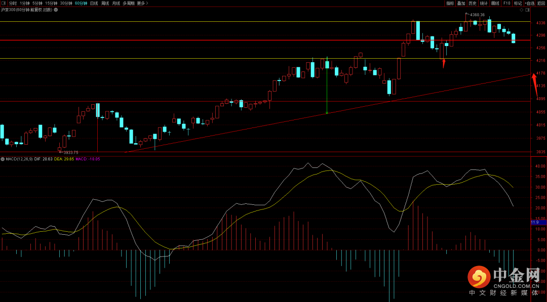 沪深300短期大概率会进行六十分钟的背驰结构调整,首先需要关注4220点支撑,一旦跌破这个位置大概率会继续向下去试探4176点上升趋势线的支撑,大概率在这个位置会有个反抽的情况出现,在反抽如果无法突破4220的情形下大概率会加剧调整走势。