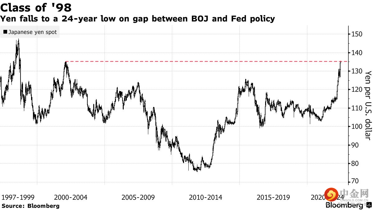 在日本央行维持利率不变以提振当地经济和美联储积极加息以控制高通胀之际,日元汇率跌至24年低点。周三亚盘,美元兑日元交投在136关口之上,今年以来日元已下跌近15%。