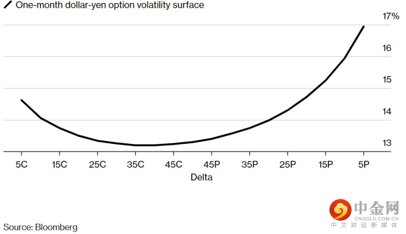 彭博汇编的数据显示,投机性很强的一个月期美元兑日元看跌期权的成本比同等看涨期权高出两个百分点以上,这表明看涨日元押注的需求增加。交易者认为所谓的delta 5价外看涨期权在到期前只有大约5%的可能被执行。下图显示,美元兑日元期权定价表明对下行保护的需求增加。