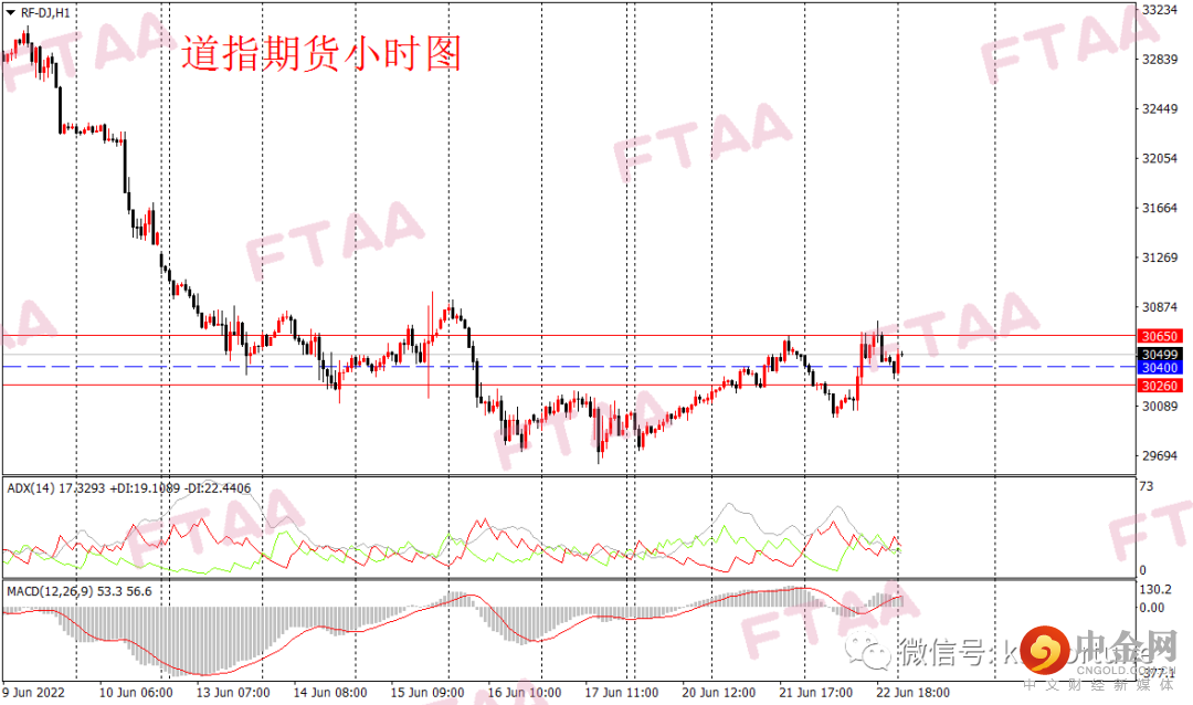 周三美股三大指数低开震荡走高,收盘微跌下跌,其中道指跌47点或0.17%。鲍威尔在听证会上再次对美国经济面临的下行风险进行预警,但同时表示坚定扼制通胀的决心。美股在讲话后持续上行。道指收出上下影小阳,显示短期多头继续主导,日图级别仍维持止跌概率。道指期货方面,昨日亚欧盘持续调整,美盘时段重回升势。当前MACD指标红盘运行,小时图形态维持震荡偏多。今早亚盘道指期货窄幅震荡,操作上可持有多单,或逢低在30400附近轻仓多,止损30260,目标30650。