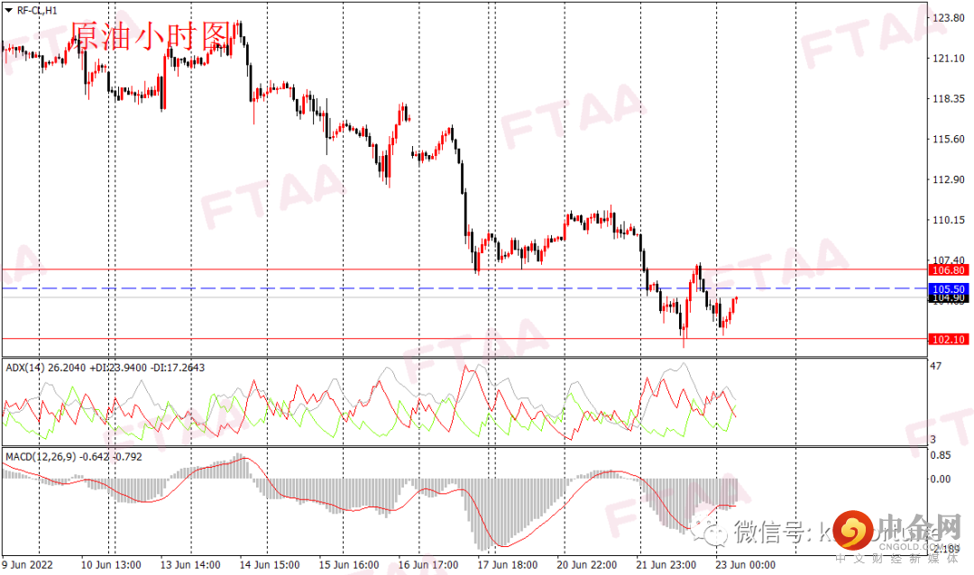 原油周三大幅下跌,最高109.22,最低101.51,日图收出下影长阴,显示短期空头继续发力,确认了此前两日震荡的下跌中继概率。通胀继续成为短期市场关注焦点,美国总统拜登和美联储主席鲍威尔互相甩锅,最后指向油价大涨中受益的俄罗斯,拜登政府继续表示控油价意愿。油价昨日亚欧盘持续回落,美盘时段震荡止跌。当前小时图MACD指标底背离,短线或进入震荡,今早亚盘油价探底后当前回升,短线震荡或延续。操作上可观望,或逢高在105.50附近空,止损106.80,目标102.10。