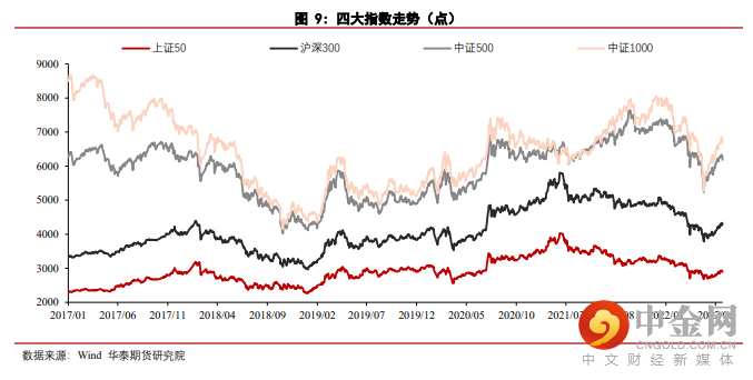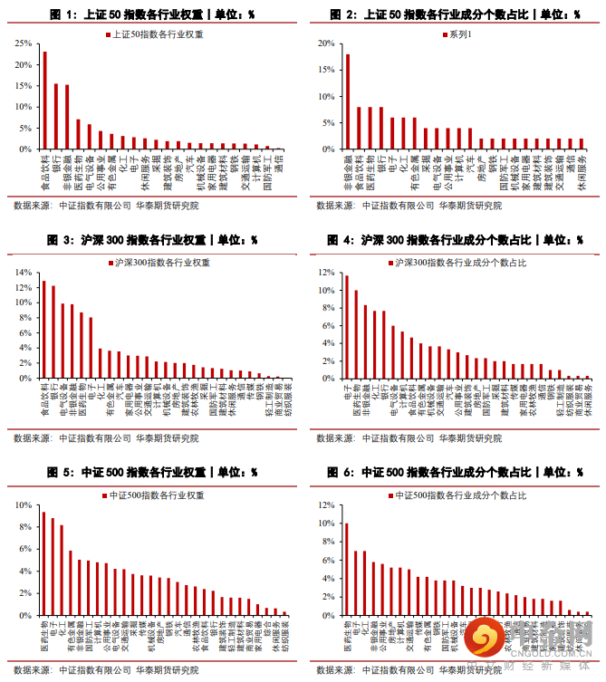 上证50指数和沪深300指数以大金融板块为主,占比达四成。中证1000指数与中证500指数类似,以具高成长性的医药生物、电子、电气设备、计算机行业,和周期板块化工、有色金属、机械设备行业为主,其余行业分布较为均匀,中证1000指数中权重最大行业的为化工和医药生物,占比分别为13.3%、10.1%。