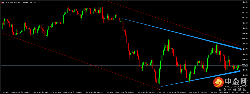 原油市场方面,美国原油(USOIL)在技术形态上出现分歧:1小时图显示K线仍然受困于下行通道中,而30分钟图上却形成了一个三角走势——预示价格突破的可能性正在增加。原油市场交易者可以关注未来10-12个小时内的原油价格走势。