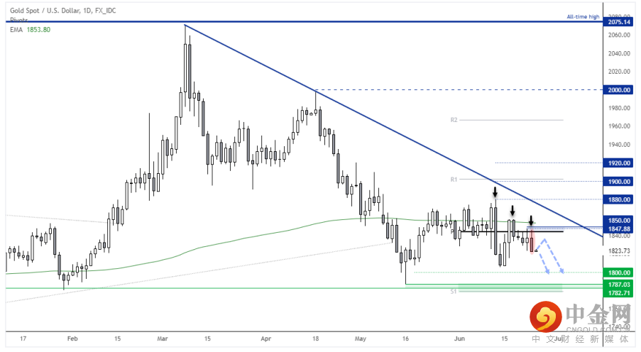 黄金日图最近几周震荡起伏,但在形成三根实体不小的阴线和两个下降的高点后,动能似乎向下。昨天的高点未破1850阻力区域/月图枢轴位,目前受制于200天指数移动均线。我们或考虑在昨天高点下方寻找看跌反转形态,或在突破昨天低点后假设价格下探1800。