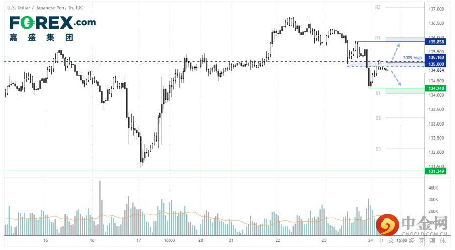 135阻力区间仍是交易者需要重点关注的区域。价格目前落在日图枢轴点位和2009年高点之下,如果动能向下,我们看跌今天走势,重点关注134.24。但若站上135.20,我们转向看涨,上看136阻力区域。