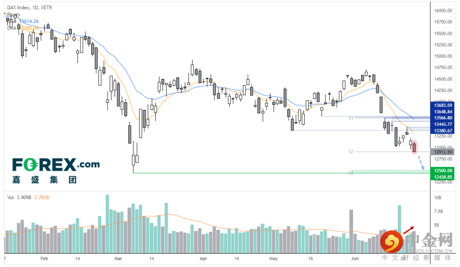 DAX因疲弱欧洲经济数据而跌至3个月低点。波段高点未破10天指数移动均线且价格跳空下跌,昨天收于当天低点,即月图第2支撑中枢。下破12,900则继续下跌可期,目标12,500支撑区域。在13,443下方继续看跌,但我们亦可以13,200一线为风险管理调整位。
