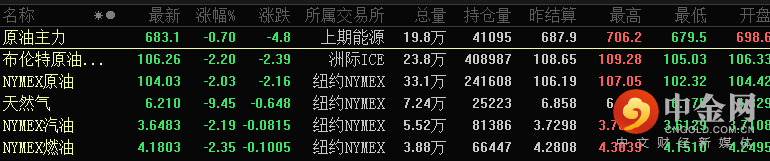截至今日凌晨收盘,WTI 8月原油期货跌幅1.81%,报104.27美元/桶。布伦特8月原油期货跌幅1.51%,报110.05美元/桶。