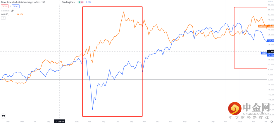 比如在2020年3月爆发的新冠股灾中,道琼斯平均工业指数(DJIA)连续熔断4次,在短短几个星期内暴跌高达40%以上,而同期的黄金价格却高歌猛进,连续大涨超过40%。