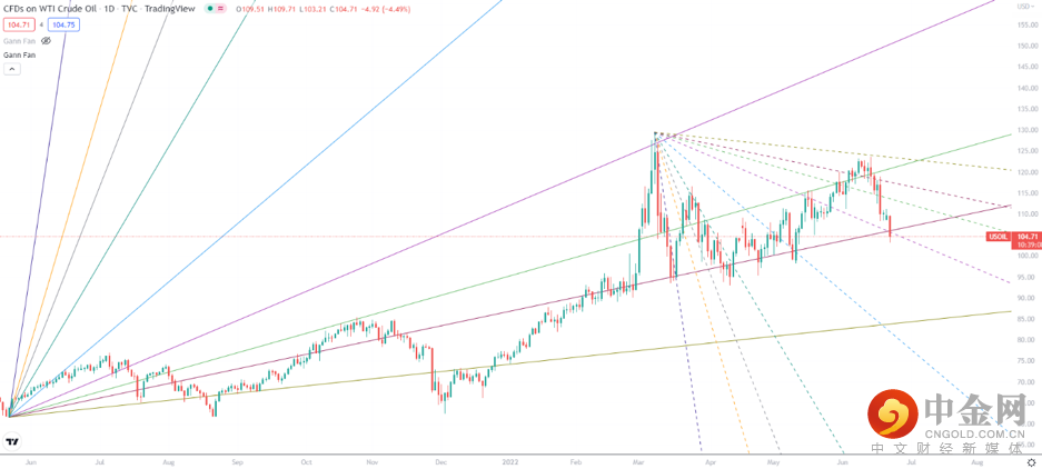 以美国原油(USOIL)价格走势为例,我们可以通过江恩扇形指标看到,该指标从原点投射出的多条射线,这些射线不偏不倚地正好成为了无数次价格波动的支撑和阻力位。
