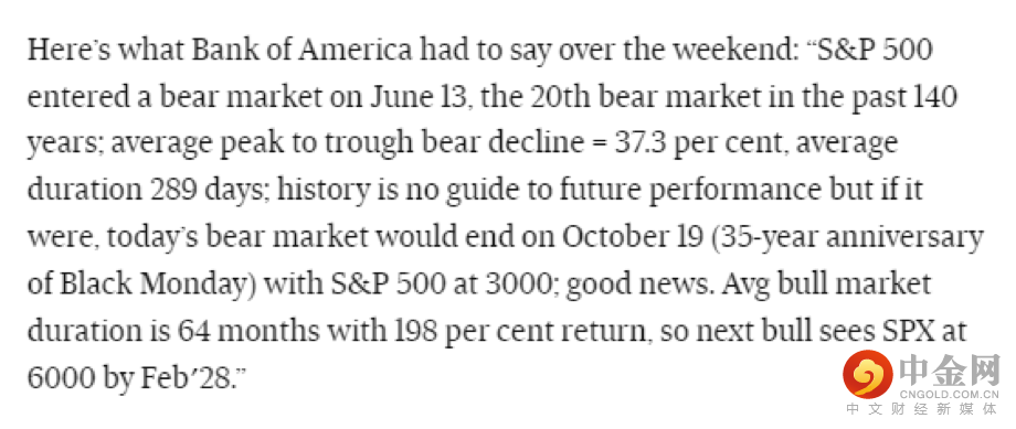 本周三,美国银行就大胆发布了对市场底部的预测,美银分析团队在报告中指出:“标普500指数在6月13日进入熊市,成为过去140年来的第20个熊市;(该股指)平均顶部到底部时间为289天,平均跌幅为37.3%……虽然历史数据不能保证未来表现,但是如果以历史数据为参照,那么预计标普500指数触底时间将为10月19日,点位应在3,000点。”