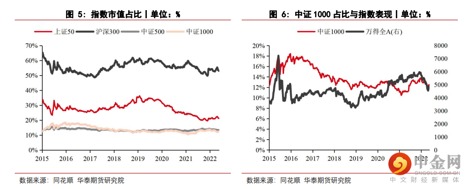 从市值占比来看,相比于上证50占比的持续下降,以及沪深300占比的大幅波动,中证1000近年来变化不大,其占全市场的比例长期保持在13%附近。
