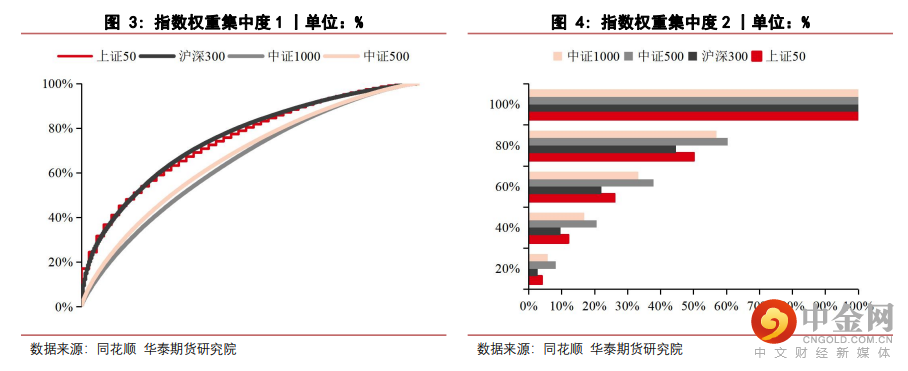 市值分布的差异性导致了各指数的权重集中度也存在较大差别,上证50与沪深300的权重较为集中,而中证500与中证1000的权重较为分散。