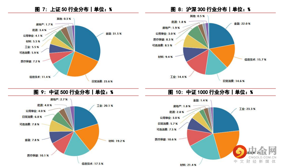 从行业分布来看,中证1000与中证500的行业分布较相似,在工业、信息技术、材料、医疗保健、可选消费等行业上的权重较高。
