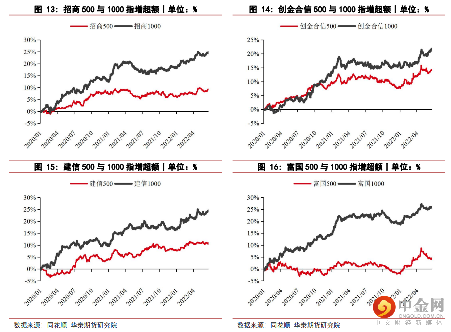 以公募为例,从同一管理人的中证500指数增强基金以及中证1000指数增强基金的超额收益情况来看,四个管理人的1000指增超额都显著跑赢500指增超额。