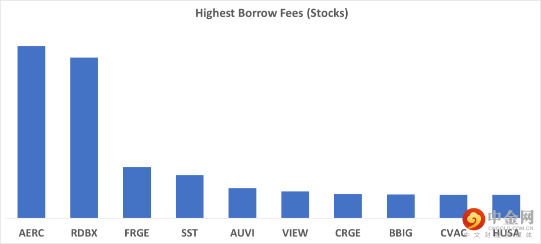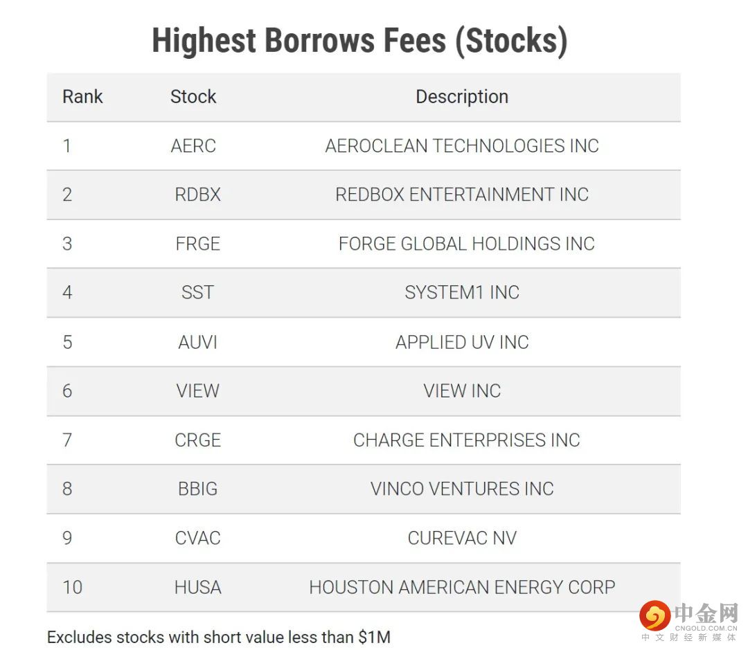 下表中列出的是2022/6/16具有最高借入费用的10个证券。