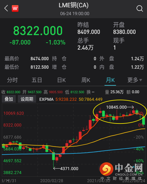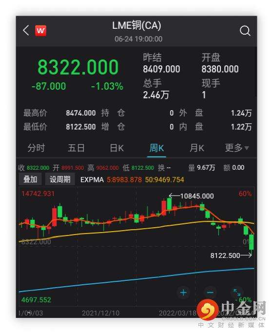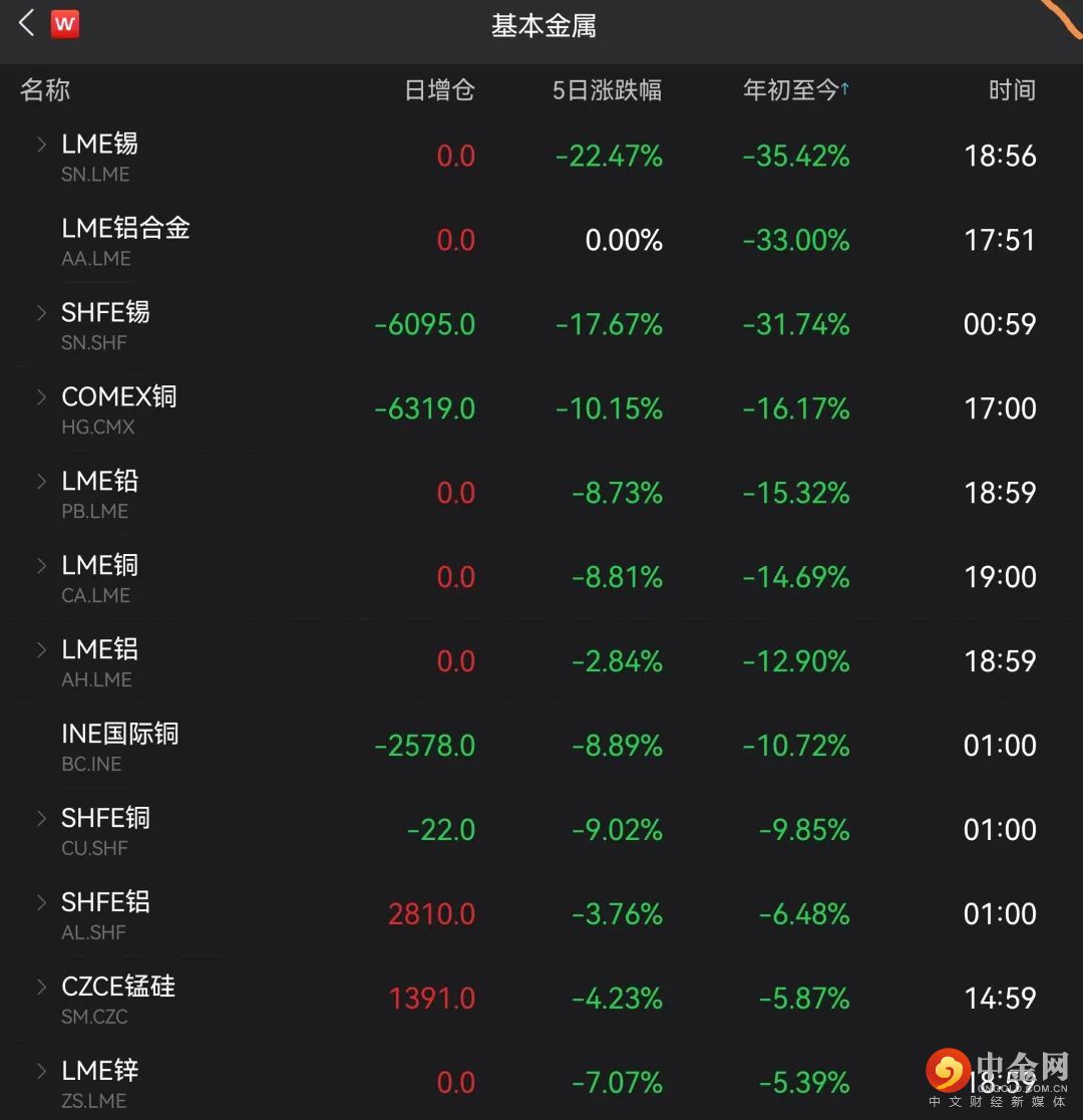其它金属也全面崩塌:伦铅跌超7%,伦锌跌近5%,均连跌三周;伦铝跌约1.7%,连跌五周。市场担心,铜价已经从高点下跌逾23% ,跌至16个月低点,反映全球经济“衰退”风险超过“通胀”风险,全球衰退、大宗见顶的呼声再起。