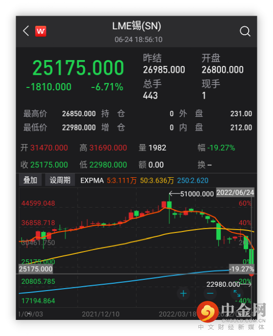 连跌两周的伦锡继续领跌,近一周跌20%,跌幅几乎为上周的两倍,价格已较今年3月的高点腰斩。