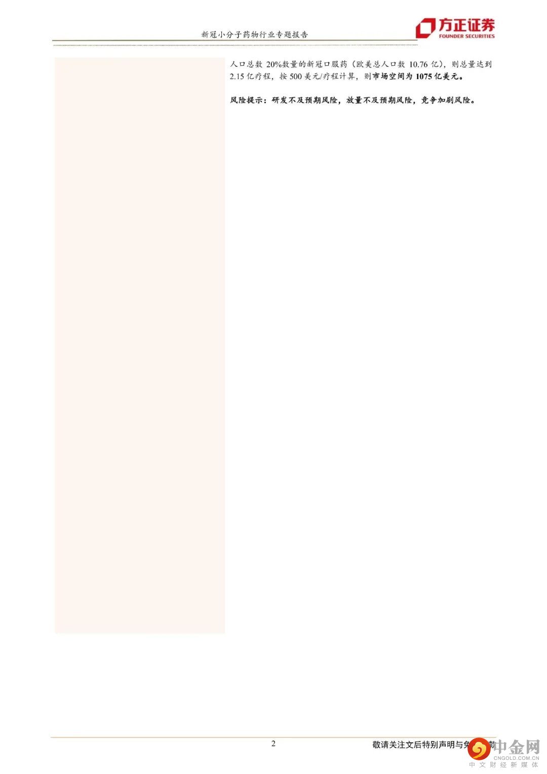 按照目前国内新冠口服药的研发进度,2023年将是国产新冠口服药的上市元年,在此前2009年3-4月,北美发现新的甲型H1N1流感病毒,引发了21世纪第一次流感大流行,疫情不到半年的时间内迅速传遍全球。WHO推荐各国储备的抗病毒药物需覆盖全国人口的20%,美国在此次甲型H1N1流行期间抗病毒药物储备达24%,而中国为2%,墨西哥为1%。那么假设我国分三年完成覆盖10%总人口的药物储备,2023-2025年分别采购3000万人份,5000万分人,6000万人份,新冠口服药单价逐年下降,分别为600元/疗程,300元/疗程,150元/疗程,则市场空间约为420亿元。