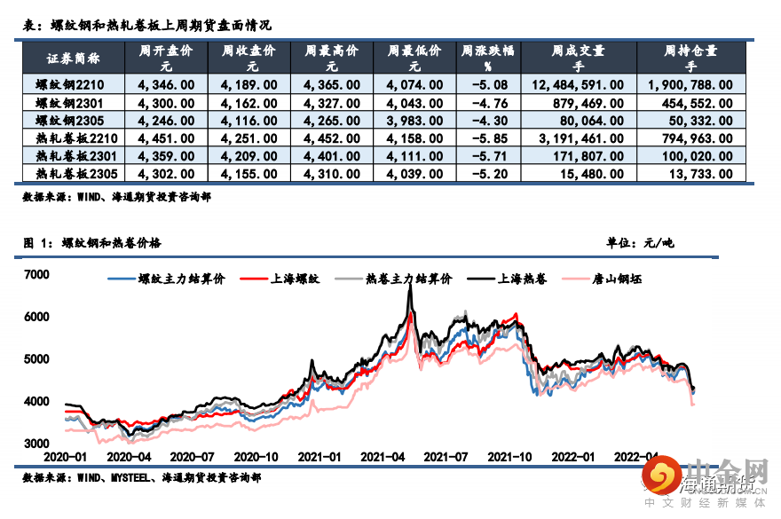 上周钢材期货盘面价格呈底部震荡格局,现货价格继续大幅走弱。上周螺纹钢 2210 合约下跌 5.08%