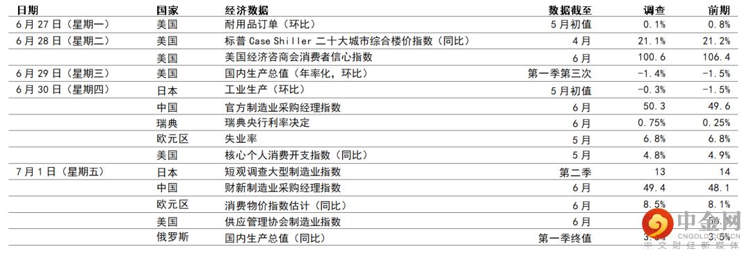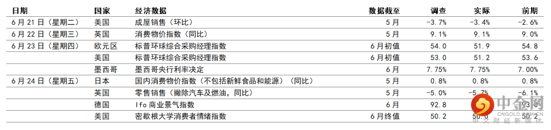 欧元区方面,预期6月份消费物价指数通胀将达到8.5%(同比),为欧元区新高。按月计算,预期物价升0.6%(环比),能源和食品价格可能急升。核心消费物价指数可能在6月份录得3.9%(同比)升幅,整体水平与英国和美国相若(仍然较后两者低),但欧洲央行政策官员仍然认为过高。